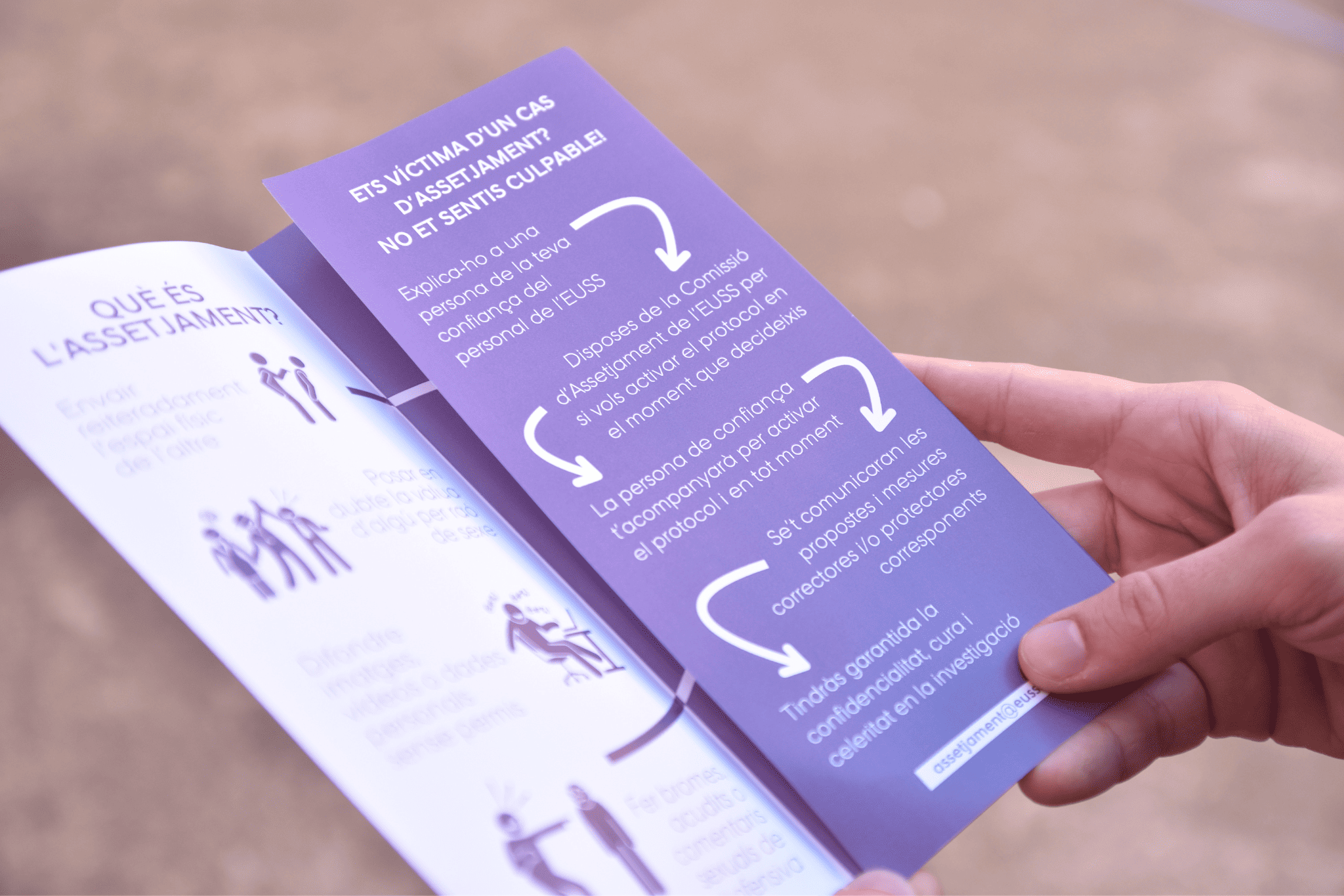 Amb el nou tríptic, la Comissió d’Igualtat de l’EUSS vol traslladar a personal i alumnat la voluntat d’acompanyar i tenir cura de qualsevol persona que pugui sentir-se víctima d’assetjament. Per aquest motiu, el fulletó remarca la importància de no sentir-se culpable en cas de ser víctima d’assetjament i els passos que cal seguir davant d’una situació com aquesta. La Comissió d’Igualtat garanteix també la confidencialitat i la celeritat davant de qualsevol testimoni d’assetjament, tal com es remarca en el 'Protocol per prevenir i actuar contra l’assetjament sexual, l’assetjament per raó de sexe, orientació sexual, identitat de gènere o expressió de gènere, violència masclista, violència psicològica i/o física, violència digital o ciberassetjament i l’assetjament laboral de l’EUSS'.